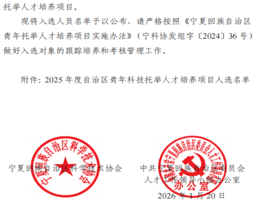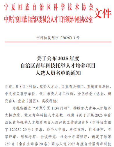 近日,宁夏回族自治区科学技术协会与中共宁夏回族自治区委员会人才工作领导小组办公室联合印发通知,公布2025年度自治区青年科技托举人才培养项目入选人员名单。我院智慧化工绿色低碳安全技术创新团队负责人吴江龙博士成功入选。