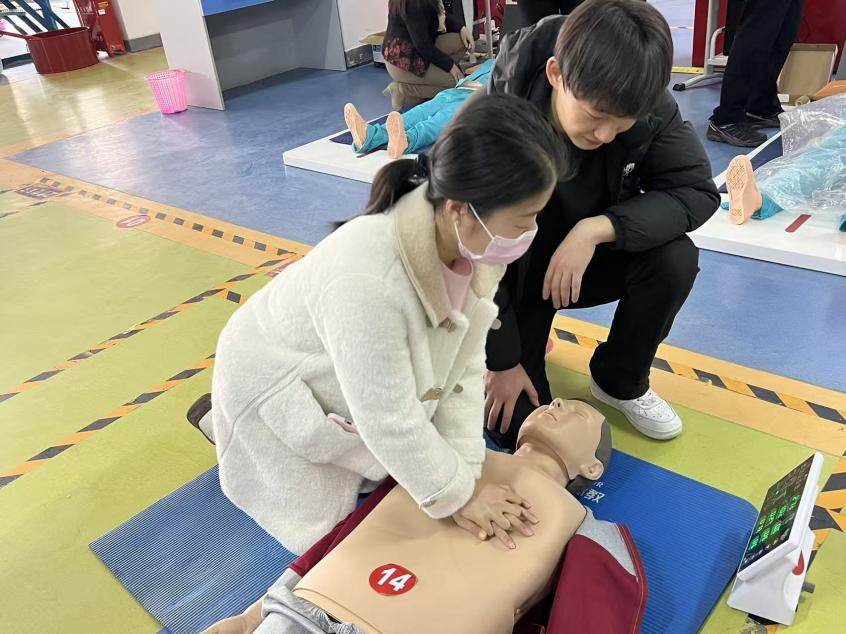 活动现场气氛热烈,内容紧扣安全主题。参与活动的教师们积极投身于各项互动体验中:从对国家总体安全观的宣讲学习,到师生典型校园生活VR场景的隐患排查;从消防安全标志的应用场景识读,到心肺复苏急救、气道梗阻急救术、意外创伤包扎术的实操演练;从AED除颤仪的规范使用,到火场灭火及逃生救援绳的制作。通过一系列“师生互动、互帮互学”的沉浸式体验,教师们在轻松活泼的氛围中掌握了实用的应急救护技能。